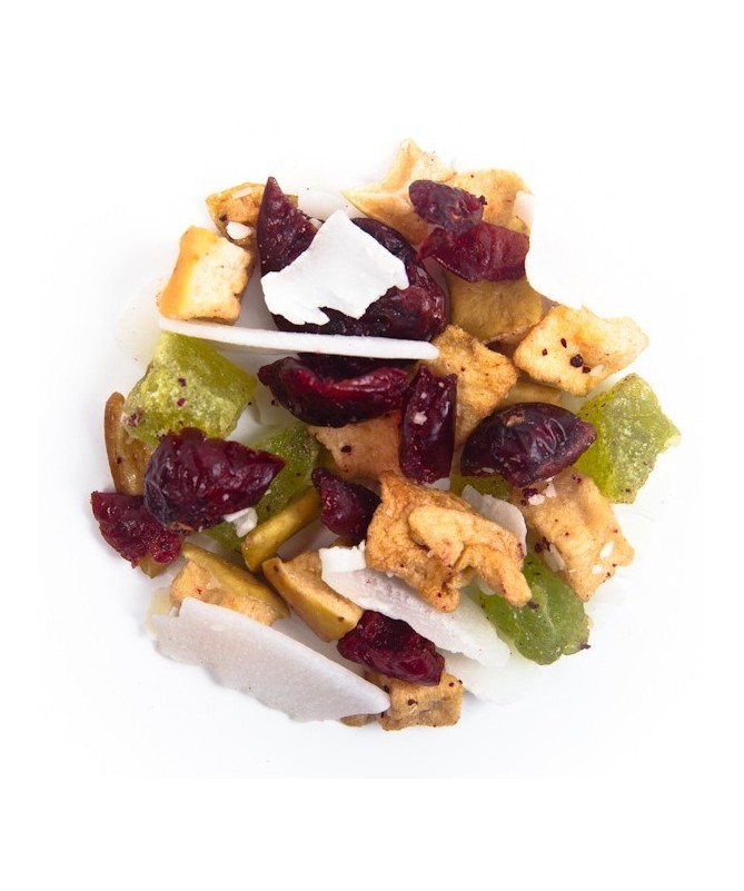 La tisana de coco arándano es una infusión de hierbas sin cafeína que se elabora con coco rallado, Arándano, coco, cereza, manzana y kiwi.