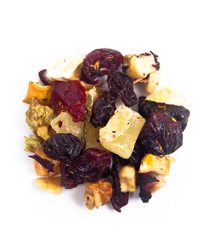 La tisana Serena Pasión es una infusión de hierbas y flores que se caracteriza por su sabor suave y floral. Está compuesta por una mezcla de Cereza, arándano, piña, manzana, uva, jamaica, escaramujo y flor de calabacín. que se combinan para crear una bebida relajante y reconfortante. La tisana serena pasión es una excelente opción para aquellos que buscan una bebida relajante y natural que los ayude a calmar sus nervios y reducir el estrés. Además, su aroma floral y suave la hacen ideal para disfrutar en cualquier momento del día.